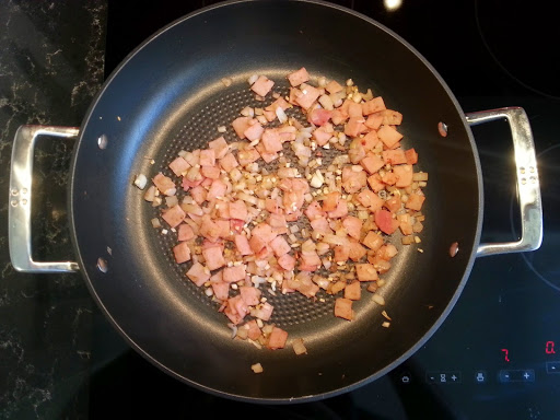 - Cook eschallotts and bacon in a small dash of rice bran oil on medium heat until eschallotts are transparent and bacon is cooked. Add garlic, cook for one minute further.