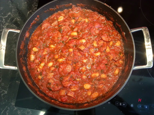 - Add chorizo, canned tomatoes, spinach, butter beans, salt and pepper (if required, though the bacon and chorizo have quite the punch on their own).