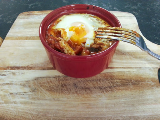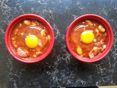Distribute half the mix evenly in two ceramic dishes (called casuelas). Create a crater in the centre of each, and break an egg into each crater. If you are just making breakfast for 4, then use either 4 casuelas or one casserole dish and crack 4 eggs in.