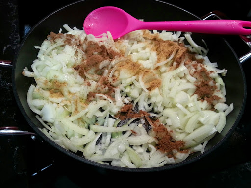 So many onions! - Heat rice bran oil, add onion, allspice and ground coriander seed. Cook until the onion softens.