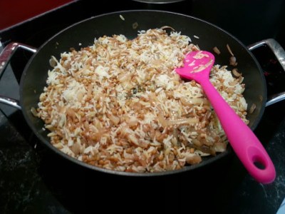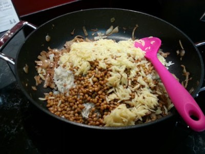 Crunchy noms - While the onions cook, make pasta and rice, drain each.