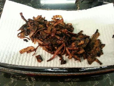 - Remove a portion of the onions. Add a bit of flour, then fry onions in a small pan until crispy. Remove from heat and allow to cool on a paper towel.