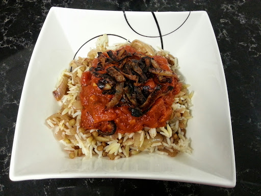 Koshari is a staple in Egypt – you can purchase it from vendors on the street who serve it from huge metal cauldrons, from restaurants, and it is eaten in homes around the country. The dish purportedly originated in the mid-1800s. Some think that koshari originates from khichri – a rice and lentil mix. The ingredients reflect its multi-cultural origins and it can be made a few different ways, so I feel free to take a few liberties and personalise it a bit. Reportedly rice, lentils and macaroni were easily acquired and kept in bulk in most pantries around the country. Mixing them together was a way to use up food. The British troops occupying Egypt found that this was a budget friendly and safe option to consume and the locals took a strong liking to it. Its popularity only grew and Egypt has never looked back. It is also commonly consumed by Coptic Christians during lent and meat/dairy fasts.