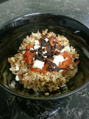 Finished mixture. Upon reflection, you could add some parsley through here is you liked. - Layer the rice mix, then the sauce, then the onions. Crumble persian feta on top. Serve! I enjoyed this with a nice glass of white wine.