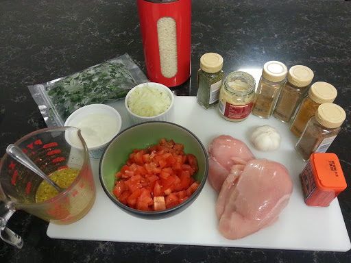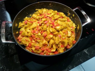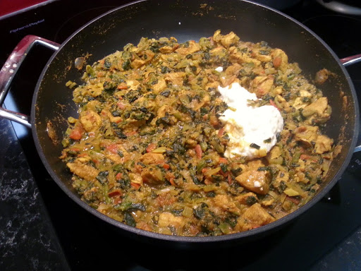 I love this meal. I was unhappy with the colour and I blame the different brand of frozen spinach that I decided to try and the less than ideal tomatoes available, but it still tasted good. I included the cottage cheese as a nod to the fact that paneer (an Indian cheese) is usually included in a palak instead of chicken, and also because I have had a delicious palak paneer once which had minced paneer (similar consistency to low fat cottage cheese) so I thought I’d give it a go. Its pretty easy and always a winner.