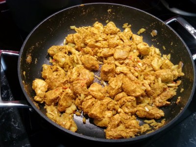 Add chicken. Coat in the curry paste and brown. Add onion and chili, cook until the chicken is cooked and the onion is transparent.