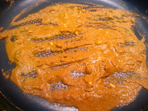 Combine spices, curry powder, garlic, ginger and 2-3 tbs water in a non stick frying pan to make the curry paste. It should be about this consistency, so adjust the water as you see fit. You could use oil instead but I’ve found that water works just as well. Cook until fragrant.