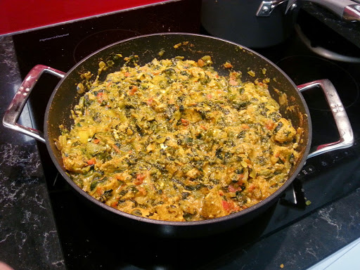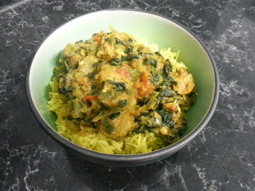 | Chicken Palak on a bed of basmati rice with turmeric stirred through the cooking water |