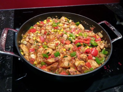 Drop the beans. Leave out the spinach and corn, stick to just red capsicum or add a yellow capsicum as well for rounding out of colours. Leave out the chili and add herbs instead. Include mince instead of chicken breast and use as a basis for burritos. Serve over greens instead of rice – this is a good option for lunch leftovers the next day. Add a dollop of guacamole/sour cream/cheese. Play with spices (eg add cumin, which may be nice). Or add potato or sweet potato into the mix to make it a casserole instead of serving over rice. For a carb free meal, serve in a lettuce cup for an asian-fusion-mexican-sang-choi-bao-style-meal…So many options.