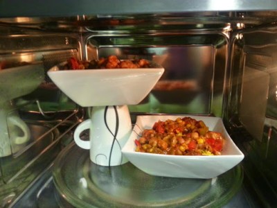 Ever get frustrated when reheating leftovers one bowl at a time? You heat one, give it to someone, and either they have to wait while it gets cold until yours is ready, or (if they are less kind and more hungry) you have to watch them eat it while you wait for yours to be ready. Well here is a handy hint to reheat two bowls of food simultaneously. Place a microwave safe mug upside down next to one bowl and place the second bowl on top of the mug. Provided that this fits in your microwave you will have two meals ready at once! Everyone wins!