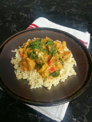 I’ve elected to try to use up some food in my pantry fridge and freezer, and this meal was a good way for me. I already had canned tomatoes, peanut butter, chicken stock, garlic, ginger, rice, the spices and frozen chicken. So shopping was really just sweet potato, spinach, onion and capsicum today. Go go gadget budgeting!