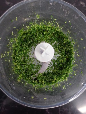 Combine basil leaves, nuts and garlic. Blitz until they are all about the same size. You may need to use a spatula to clean the sides a couple of times.