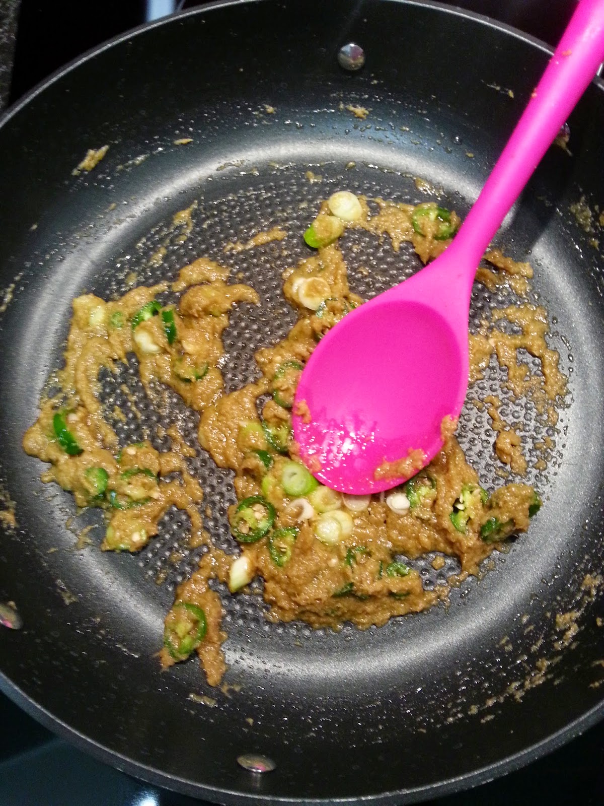 - Add green curry paste to and half of the chillies and half of the shallots, cook until fragrant.