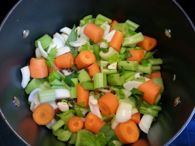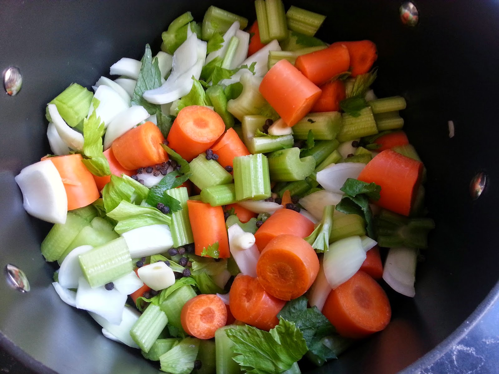 Provided that you make it on a day when you plan to be home for a few hours it is pretty low maintenance. The only time required is to roughly chop the veggies, boil the water, then check it occasionally until it is ready. I recommend reading the potential spins section of this post, as what I am making is a very basic version which you could jazz up all sorts of ways to make something even more spectacular. The smaller you chop the veggies the more flavour they will give to the stock.