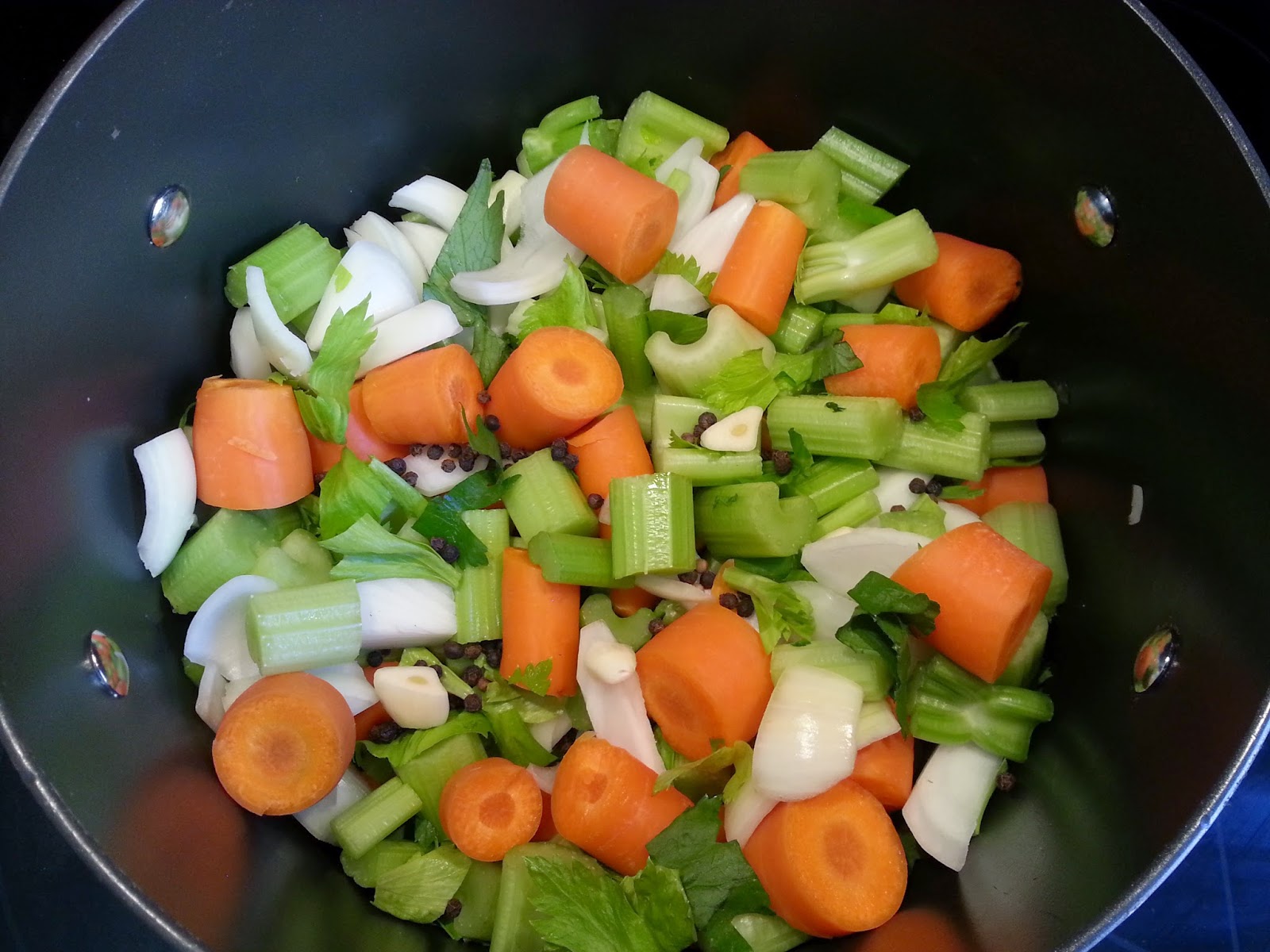 The onion and celery are less dense so rise to the top. I swear there is carrot in there! - Bring to the boil, then reduce to simmer for approximately 2-3 hours, stirring as needed. Check for seasoning after 2 hours and add salt/pepper as desired.