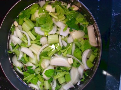 - Remove the vegetables using a sieve. These can be chucked out (I know it sounds like a waste – it felt hard to do but will get easier in time. The veggies have done their thing by this time). I did eat a few and enjoy the flavour in them, though.