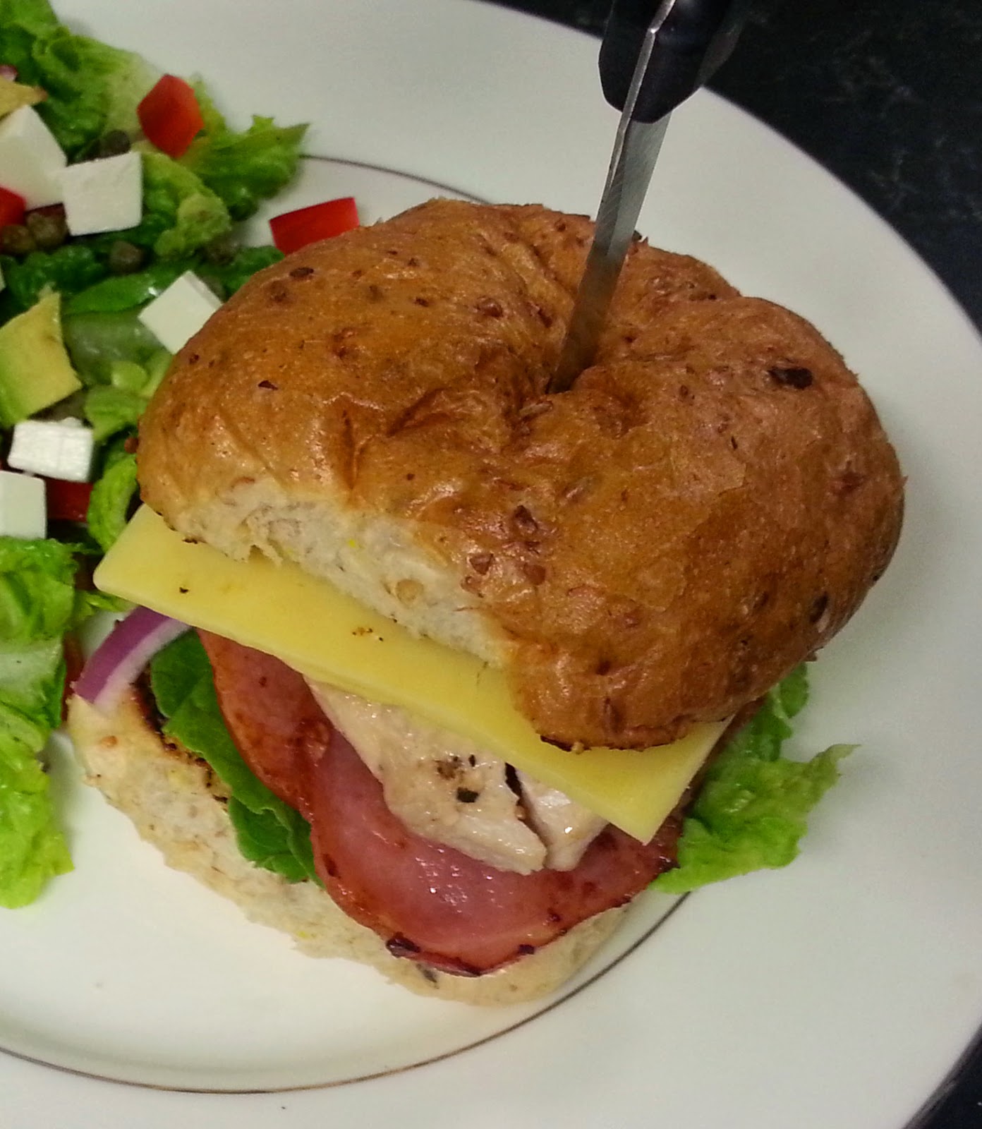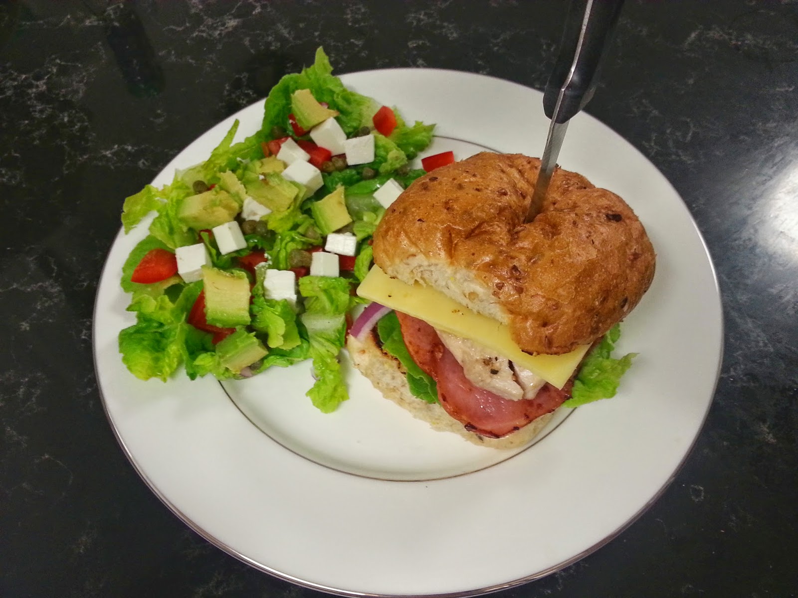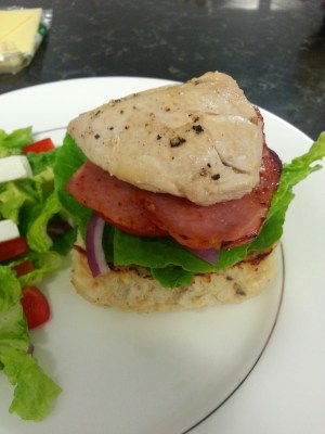 Yum yum yum yum. This was very filling and tasted as good as I had hoped. It is actually quite a simple meal. I recommend throwing the salad together while the chicken is cooking. Next time I’d pre-heat the grill, then put the burger (without the top bun) under the grill for a minute or two to melt the cheese before topping with the bun and serving.
