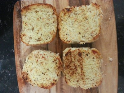- Slice open your buns, spray with a thin layer of spray olive oil and toast them in the same pan as the bacon for about 1 minute on a medium heat.