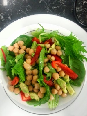 Blurry but delicious - Assemble the cold ingredients – greens. capsicum, chickpeas and avocado.
