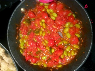 - Meanwhile, add garlic, tomatoes, chillies and edamame to another small frying pan on medium heat until cooked through. The tomatoes will soften and you will tell it is cooked when the edamame taste al dente and not too crunchy.