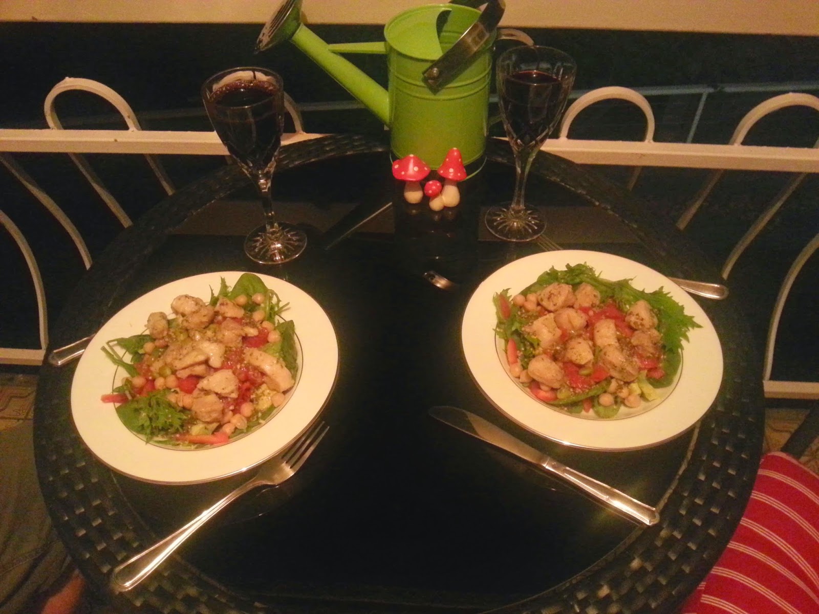 | Romantic Dinner with wine on our balcony. The new watering can is there because we have started a vertical garden on our little balcony wall…so excited! |