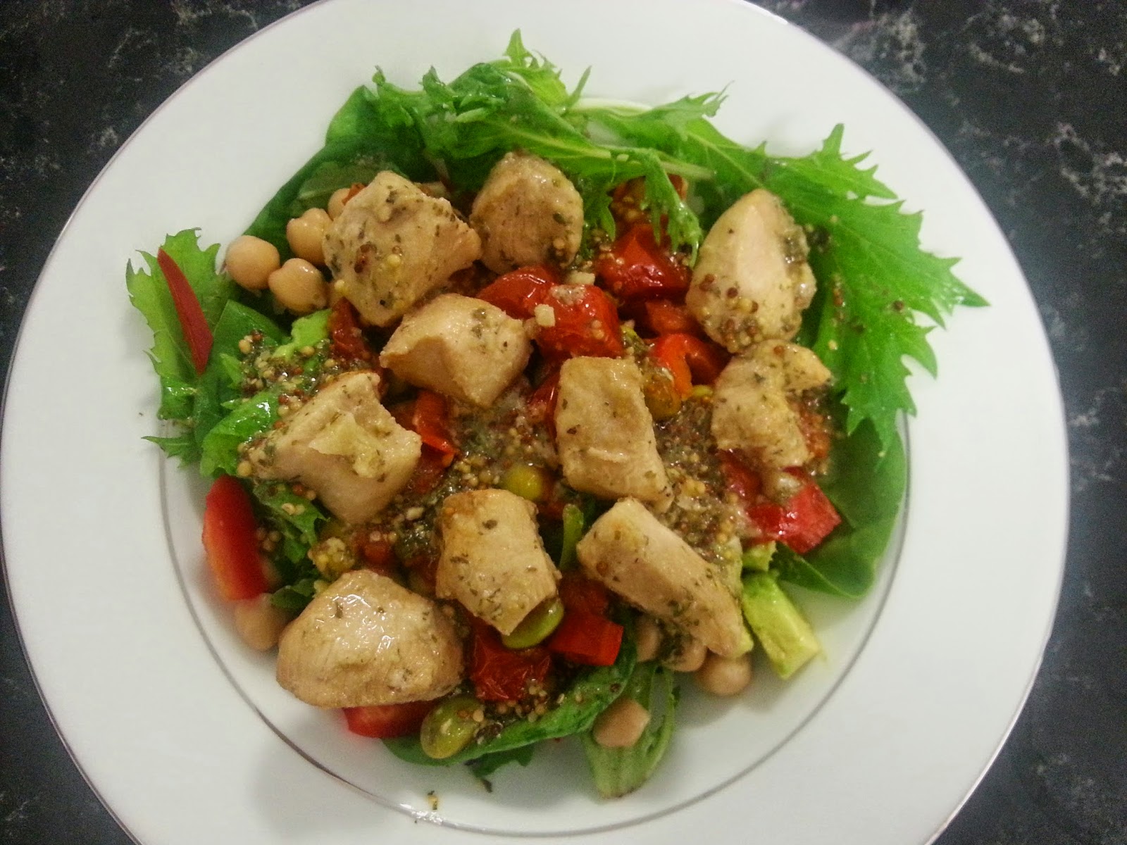 - Add the tomato and edamame mix and the chicken. Then top with dressing and – hey presto – you ‘ve got a delicious and filling meal!