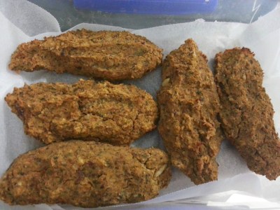 You can bake them however you like – in little rounds, or in longer segments like I do in order to fit nicely into wraps for lunch. The Dragon looked at them the first time I made them and asked “why are you baking poops?” From then on they were called Lunch Poops and I can’t call them anything else. I’ve been making them again recently in line with my goal of getting healthier so I decided to share them with you. It’s fool proof cooking and does just over 2 weeks of lunches for one or one week for two 🙂 I freeze whatever is unused, and they defrost absolutely fine. I recommend these as an easy high protein, high fibre lunch wrap filler. They taste good and I feel good after I’ve eaten them.