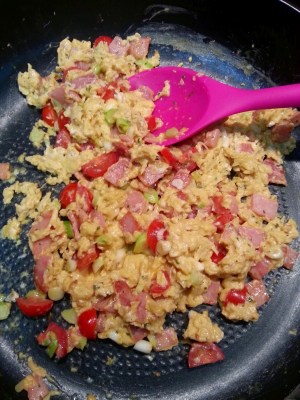 Weekend breakfast. Zomg. I love it. Breakfast is one meal I will never get sick of. Now – to be honest I love every meal of the day – but I particularly love breaking my fast. There are so many ways to make it enjoyable, and most of them are simple and easy, which goes well with my weekend morning brain fog. Having something yum starts the weekend off perfectly. Everything flows from there. I used to think that cooking breakfast had to be a big deal, but I’ve learnt that you can make a lot of simple and healthy breakfast dishes with ease. I’ve also learned that basic things like scrambled eggs, while a treat done the old fashioned way, can be spun lots of different ways pretty simply in order to keep things interesting and reduce “ugh…this again” style food fatigue. Below is a simple and tasty East meets West one-pot scrambled eggs and bacon dish. It is on the table in no time with minimal fuss. The recipe is so easy. What more could you ask?
