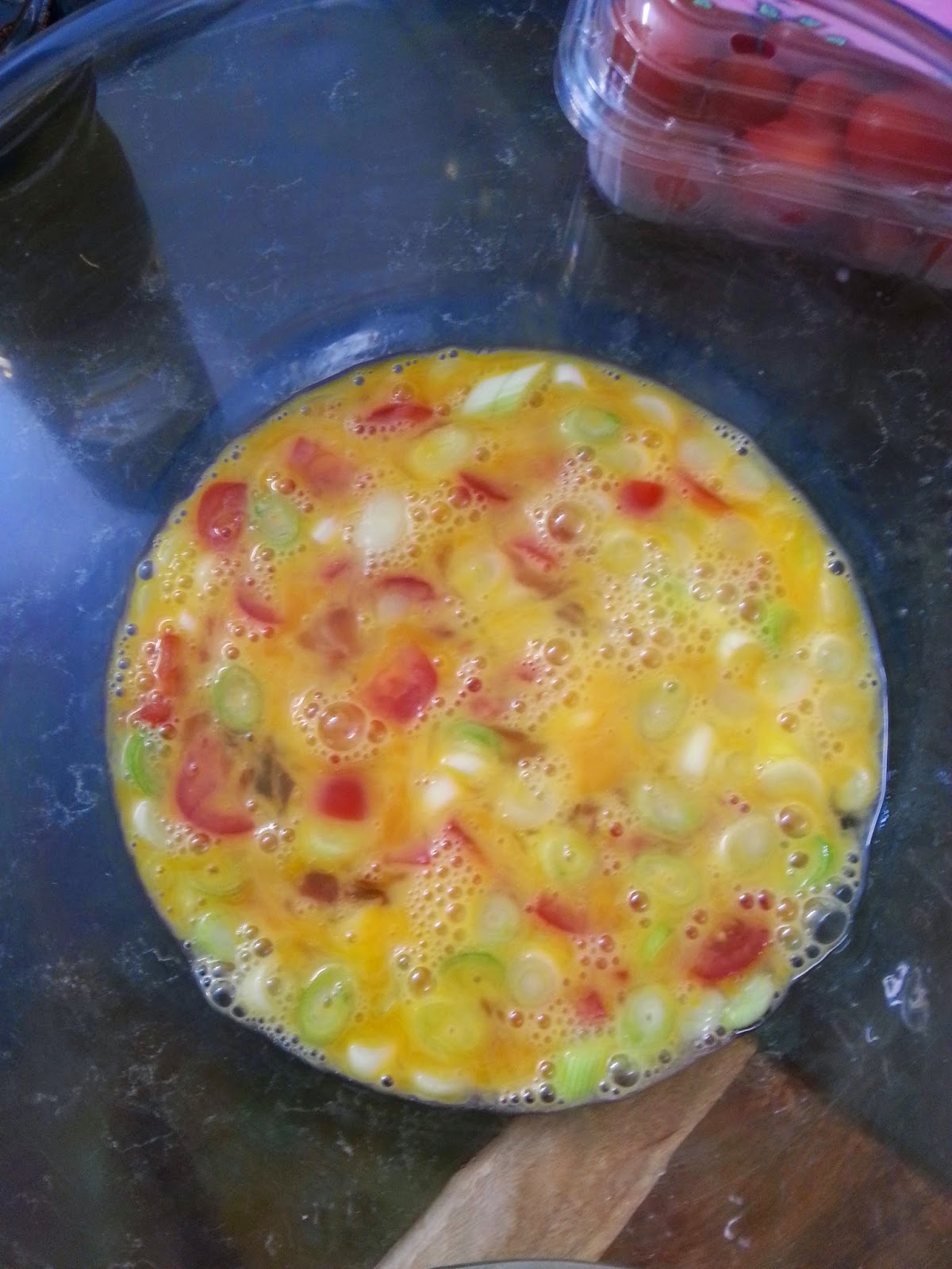 - Meanwhile, whisk eggs, spring onions, tomatoes, milk and soy sauce.