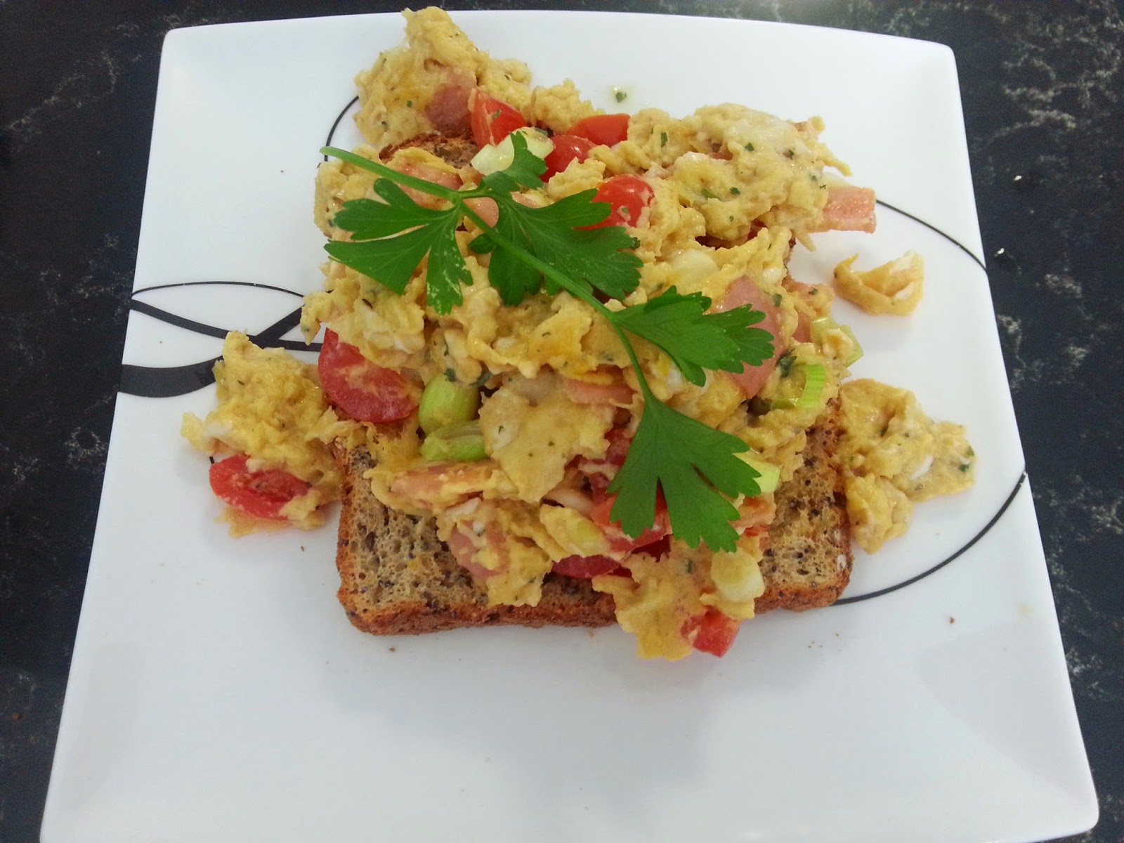- Once bacon is cooked, add egg mix to the pan, stir occasionally until cooked and toast the bread.