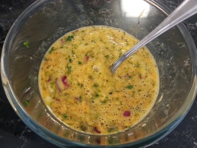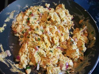 - Whisk the eggs, salmon, capers, red onion and dill in a bowl.