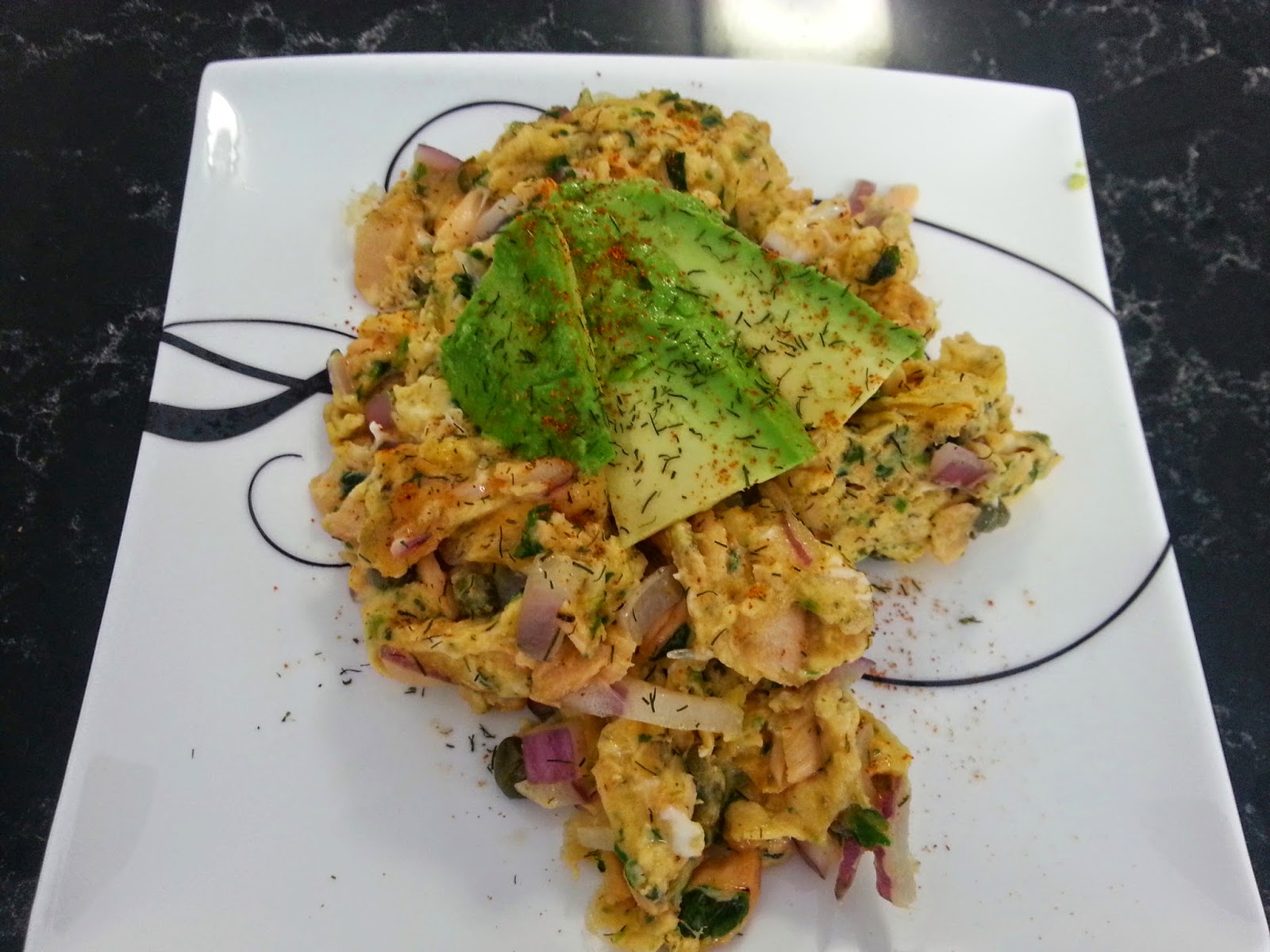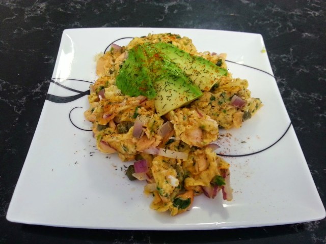 The main spin that comes to my mind is to make an omlette rather than scrambling the mixture. If you use this option, you could chop your avocado into thin slices and add it to one half of the egg mixture once it is cooked on the bottom, sprinkle on some cayenne pepper, and flip the other half over the top to make a pocket around the avocado and fry until cooked through. I may do that next weekend in fact. Or you could just cook it on low heat in the frypan until cooked through to the top for a flat omlette. Given that cream cheese goes well with smoked salmon and capers, you could always add a dollop on top or on the side with the cayenne pepper sprinkled on it rather than on the eggs, or you could stir a dollop of low fat cream cheese through the egg mixture for a healthy way of adding cheese. So many possibilities…