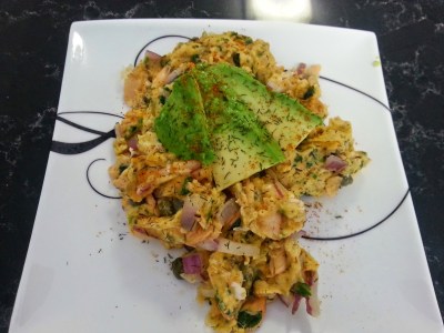 Lox is just fancy name for salmon which has been smoked and cured in brine. Its a stretch but I figure that a can of smoked salmon should be close enough to the mark for someone not in the mood to duck out to the shops for some fancy stuff. Smoked salmon, capers, cream cheese and dill was all the range in cafes a few years ago because of the salty nomminess and how well dill goes with salmon. Since I’m in a phase of finding fun spins for scrambled eggs, I was curious to find out whether I could use some of these flavours with egg – and it turns out that it is a beautiful thing. The following is a breakfast recipe which is high in omega 3, good fats and protein. Yummo.