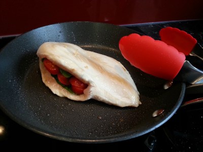 - Sear the chicken on both sides in a frypan which can also go in the oven, over medium heat. You will probably need both a spatula and tongs to do the flipping. The chicken doesn’t need to be cooked all the way through at this point (see pic).