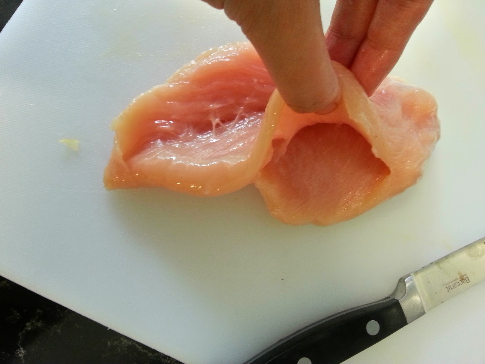 - Trim the fat from your chicken breasts, then, using a small sharp knife, slice a pocket into the thickest part.
