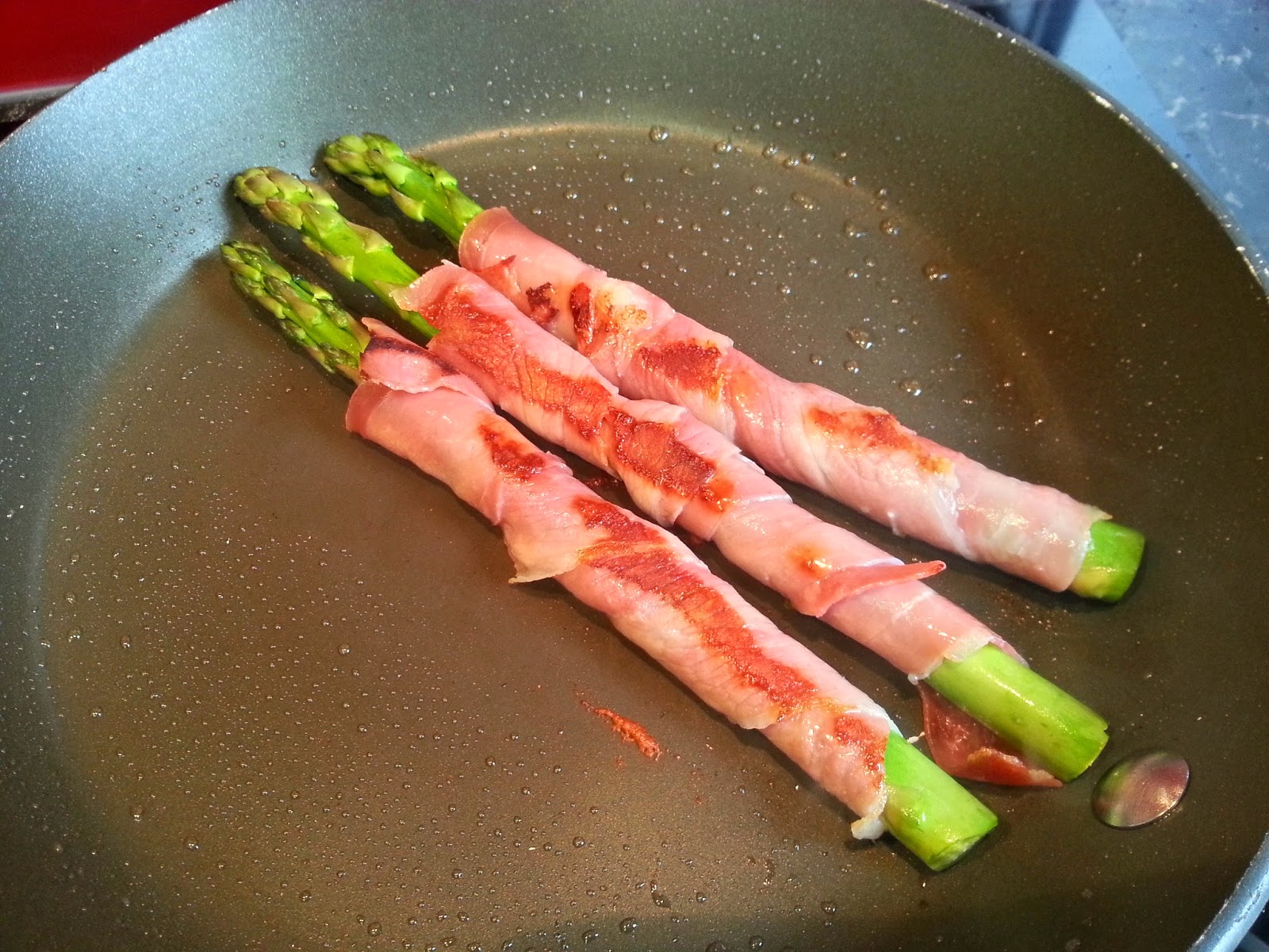 - When the oven has about 7 minutes to go, snap off the woody ends of your asparagus and wrap each piece in a thin slice of proscuitto.