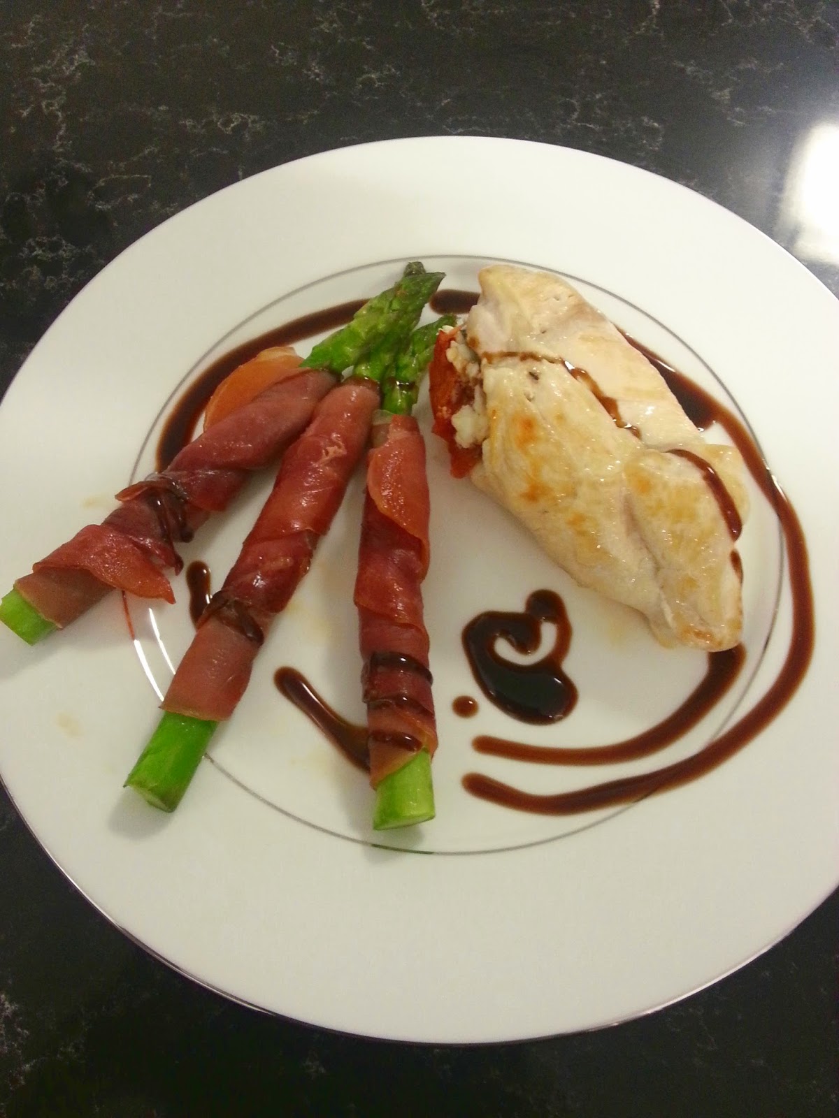 I made this meal for a romantic dinner with the Dragon. It went down a treat. He loves Mediterranean flavours and I thought this would be a fun and different meal to make him. Caprese salad is a traditional Italian side of tomato, mozzarella and basil, sometimes drizzled with olive oil and/or balsamic vinegar. It is fresh and beautiful. The first time I made this for my own lunch while home by myself and feeling fancy, I stuffed the chicken with boccocini, basil and cherry tomatoes. It was good, but I thought it could be more flavourful using sun dried tomatoes and feta instead of boccocini/mozarella. Asparagus and cured meats like proscuitto or even bacon are a match made in heaven and seemed a perfect accompaniment. It made for a lovely candlelit dinner for two.
