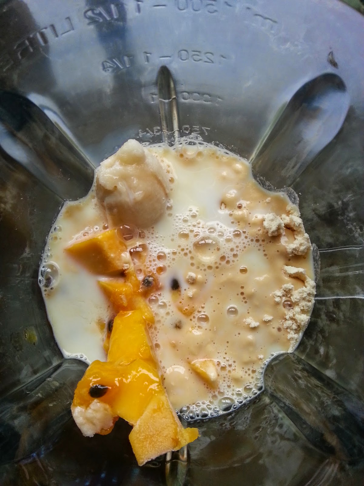 It has been hot as heck these last few weeks and living without air conditioning has not been easy. I’ve been craving cool refreshing drinks. Our go to bevvy has been soda water with lime juice….so good….but today I wanted a yummy tropical smoothie for lunch and this tasted great.