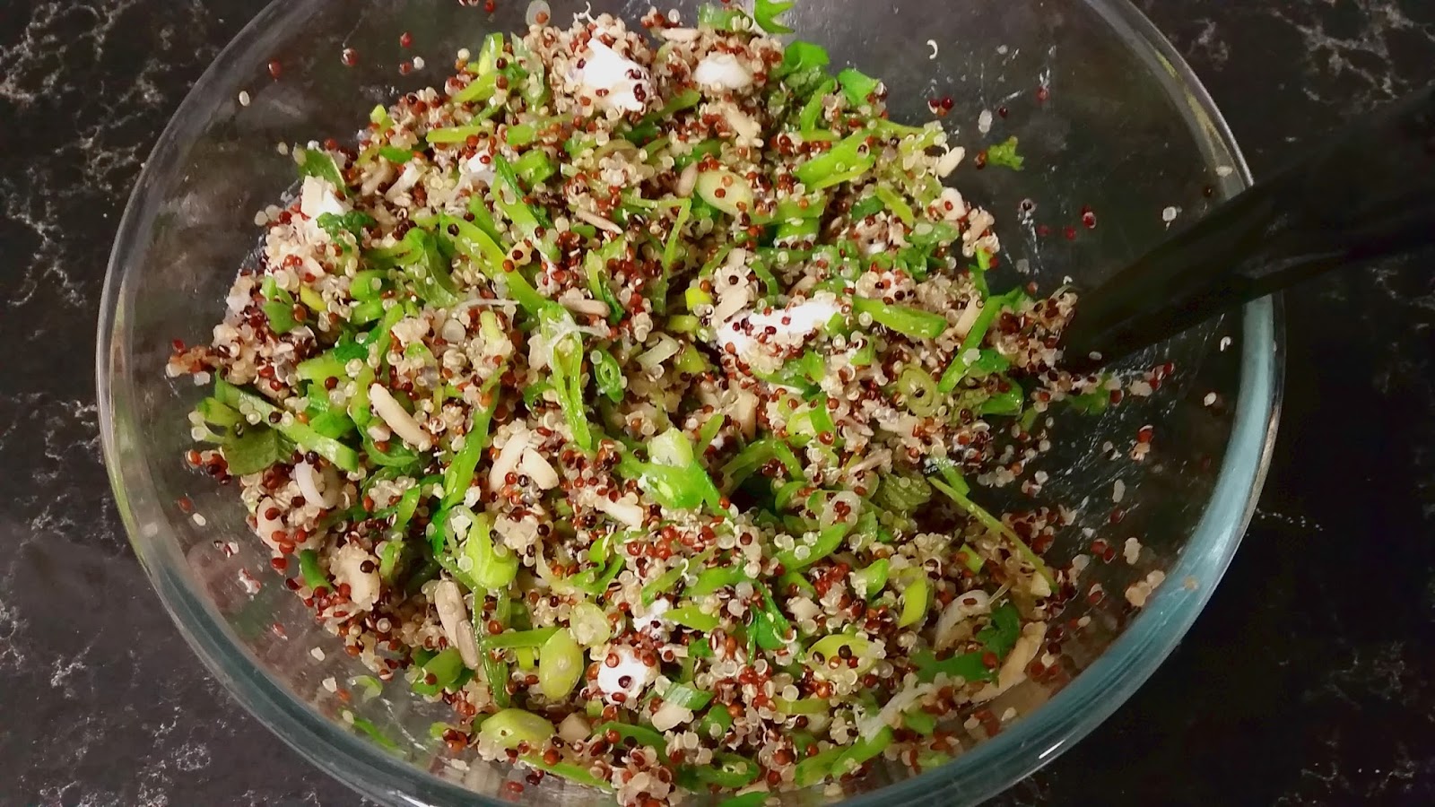 I remember quinoa, mint and feta. The rest I’ve come up with to try to fill in what I think would work – and we got to use mint and flat leaf parsely from our balcony herb garden which was lovely. I may post about our herb garden at some point because we have tried a few different methods and have finally found a method which is really working well.