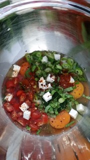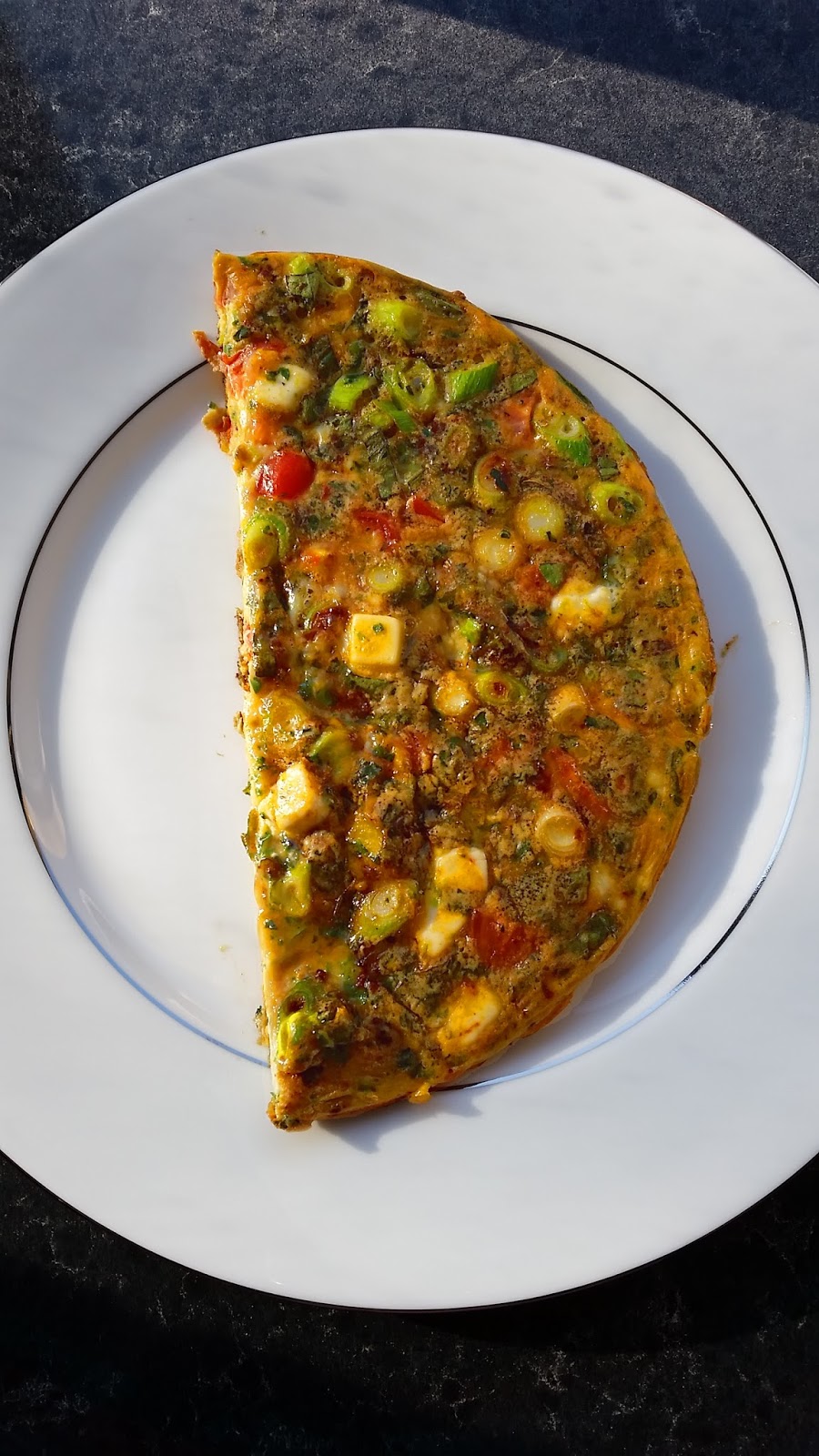 Mmmmm….Saturday morning with nowhere I have to be…..a rare and special treat. I decided to take advantage by using up a bunch of leftover veggies and feta in my fridge/herbs from my balcony garden and was incredibly happy with the healthy and delicious breakfast concoction that arose. This breakfast is almost too easy. We enjoyed eating it slowly while sipping coffee and chatting on the balcony. Happy sigh.