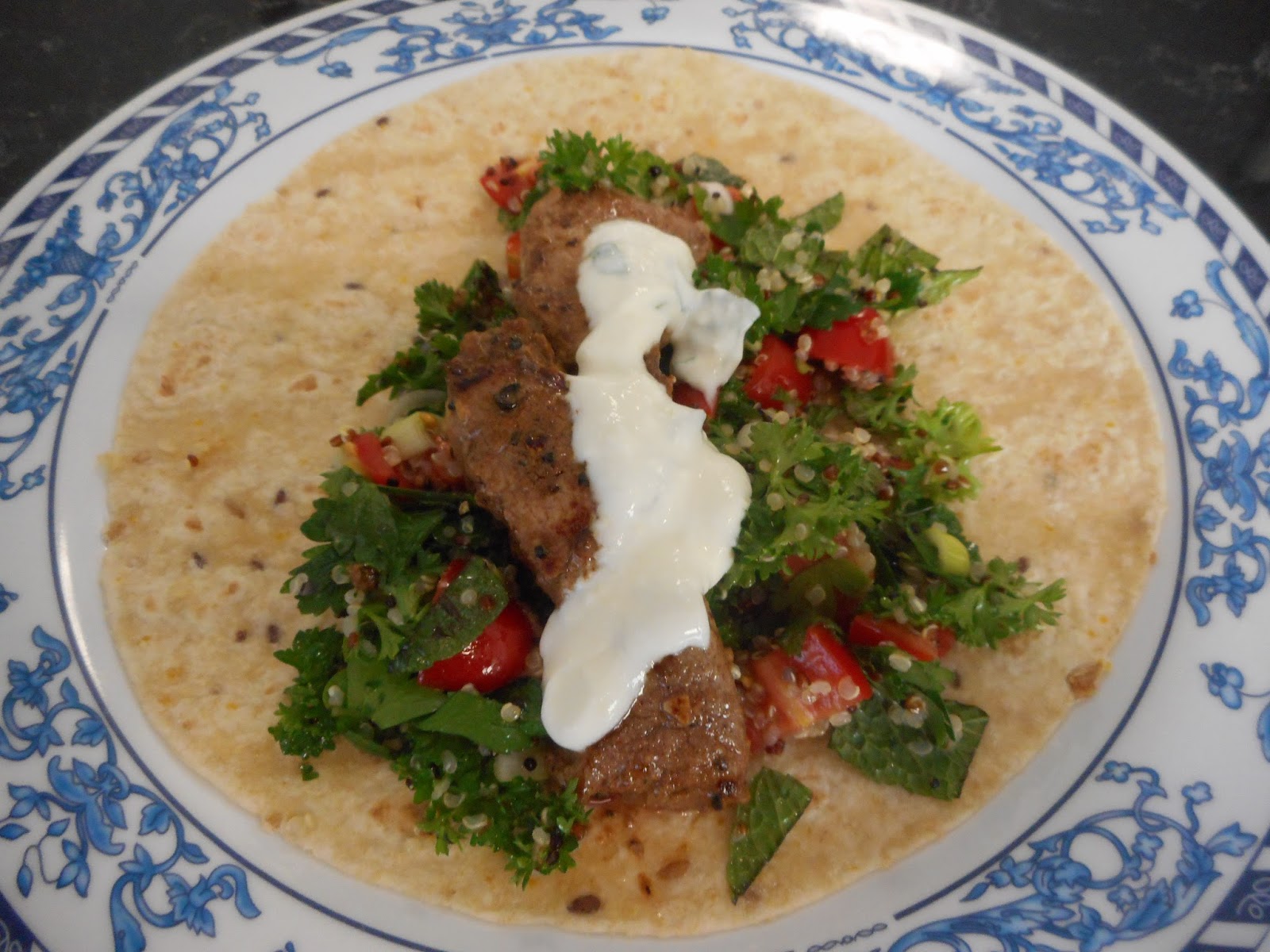 - Layer tabbouleh, then meat, then yogurt sauce onto a wrap.