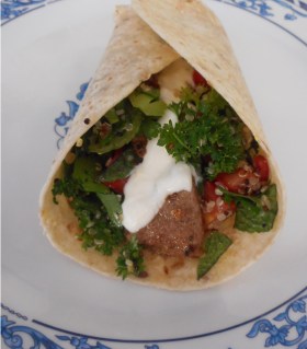 This is a transitional post – using some old familiar flavours for a simple and yummy lunch at home, using herbs from our garden. After making it I had wished that I’d used lamb mince rather than lamb steaks, as the pieces of steak (while delicious) weren’t as easy to eat in the wrap as mince would have been. I plan to bump up to creating deliciousness again over the next couple of weeks. This meal served two for two lunches, but would have served us for 3 lunches if we had used mince rather than lamb steaks.