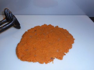 - On a floured board, add progressively more self raising flour until the mix stops sticking to your hands. I have been a naughty blogger and didn’t measure how much I use – it is always a case of just continuing until it is ready. You will know it is ready when it no longer sticks to your fingers. I like to use pre-made self raising flour for this reason, and usually enlist the Dragon’s help so I don’t get my potatoey hands all over the container when adding more flour.