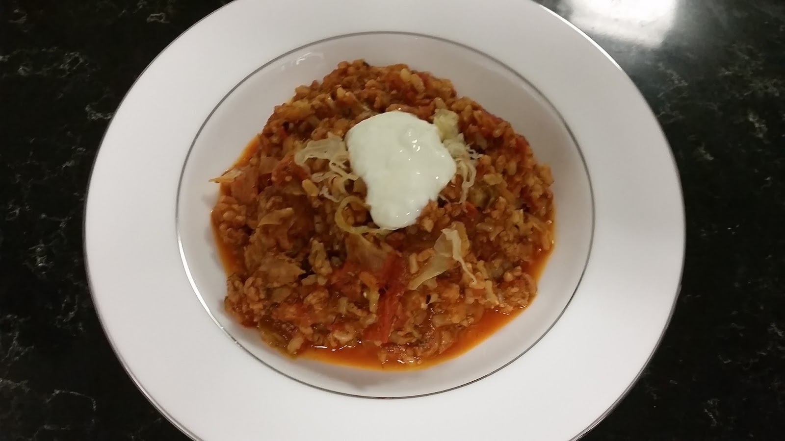 A few weeks ago, however, I stumbled across a reference to “unstuffed cabbage rolls” and my world opened back up again – why must these flavours be served in such a finicky way?  Why not just throw in all of the distinctive flavours in one pot?  So I tried my own version and I can tell you that I am a convert now.  I will never bother stuffing real cabbage rolls again.  Top this meal with a dollop of natural yoghurt with lemon rind and you have a winner!