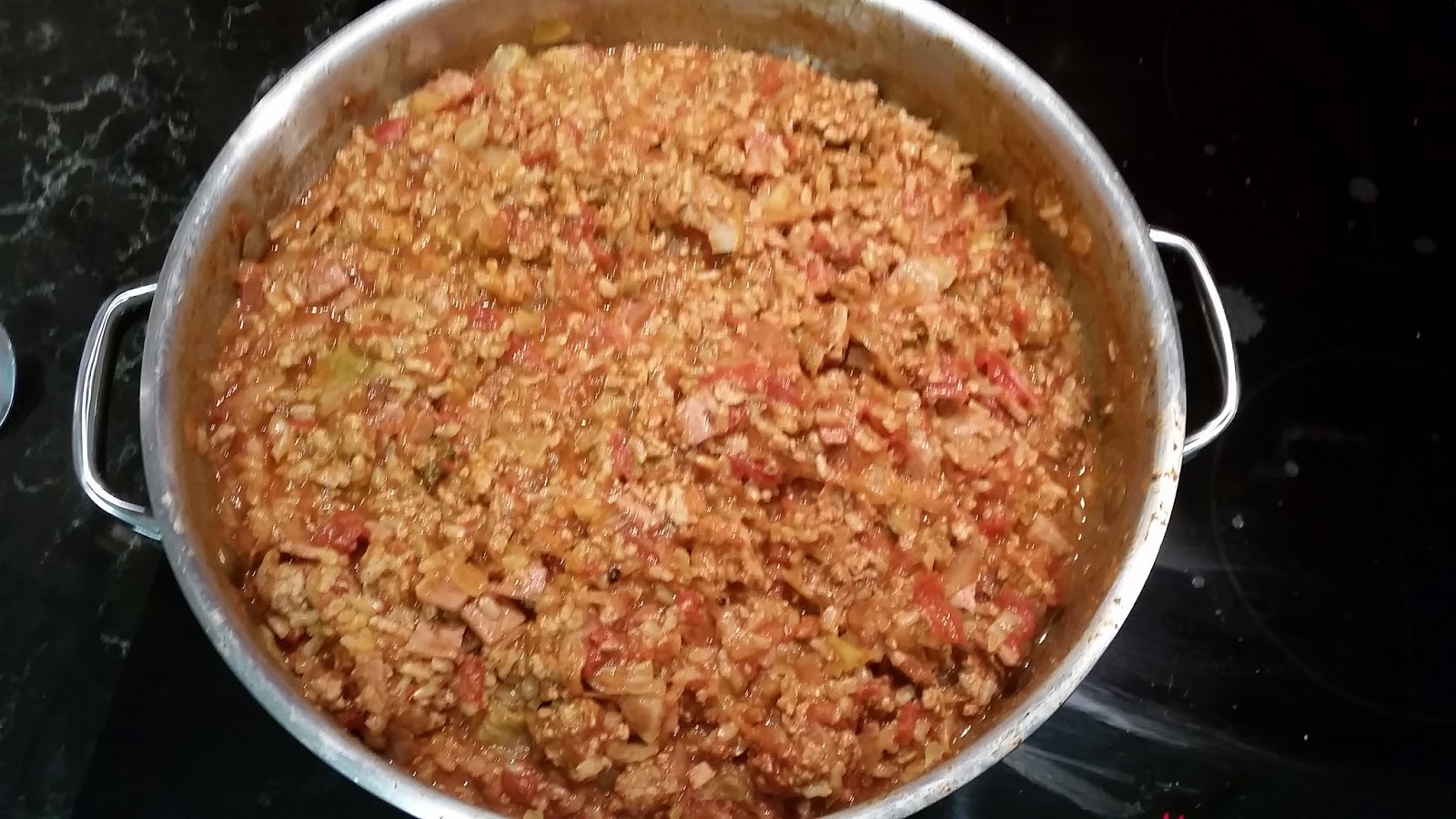 1. Brown the onion and bacon in a small amount of oil in a large frying pan until the onion is translucent and the bacon is browned.  Add garlic, tomato paste and spices, stir until fragrant.