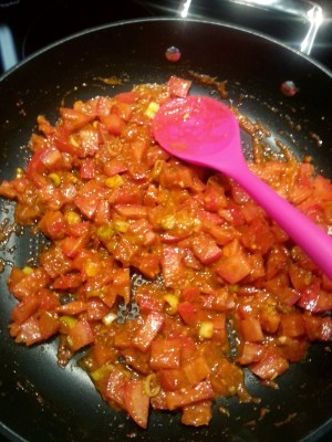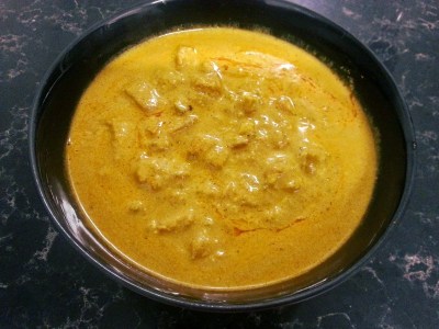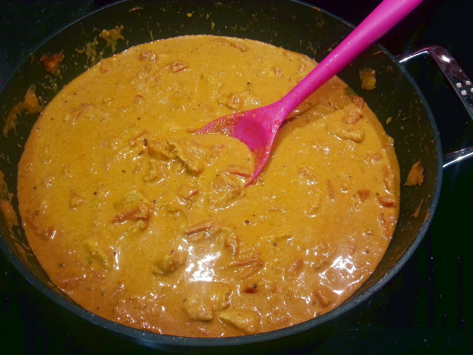 - Add butter to a medium fry pan (yes it is a lot of butter), cook onion until transluscent. Add garlic, ginger, cumin, garam marsala, turmeric, cayenne pepper, 1 bay leaf, tomato puree, 1 tbs kasundi and cook for 2 minutes or until fragrant.
