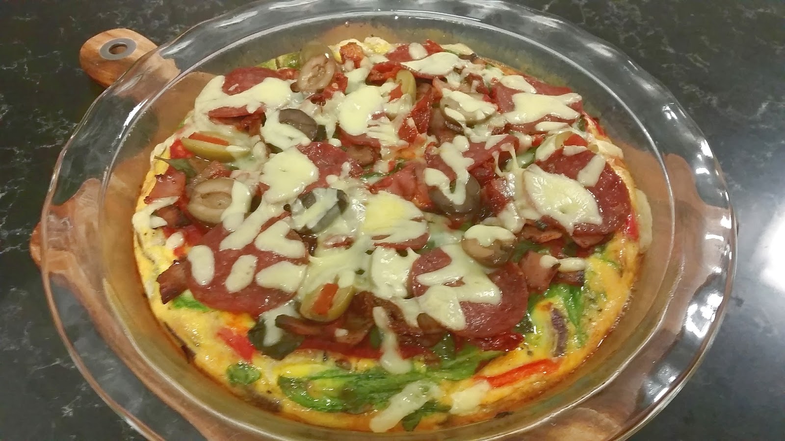 The best thing about both frittatas and pizzas is that you can pretty much throw anything into it that you like, to make whatever flavour mix catches your fancy. Go crazy. I’ve opted to put a few veggies into the frittata base and then use things like sun dried tomatoes, olives, pepperoni and bacon as toppers, but you could change that up or just throw all of your pizza flavours into the frittata instead. If you want to reduce the fat, skip the feta and grated cheese and just dust with some parmesan cheese instead. You could also use 5 whole eggs, and 6-7 egg whites to reduce fat as well.