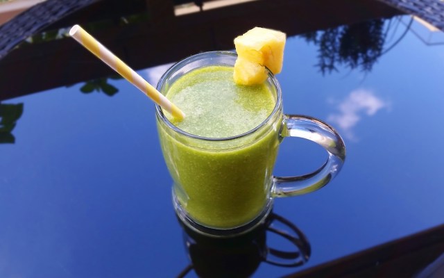 This smoothie/juice is packed with Vitamin C from the pineapple, orange and OJ (please do NOT substitute 100% orange juice for orange drink or the like), and has iron in the spinach (which is more readily absorbed by its combination with citrus fruit). Ginger, turmeric, cinnamon and honey are all classic go-tos for natural cold and flu remedies, and turmeric is most readily absorbed by the body when combined with a healthy fat, hence the coconut oil. The banana is there just to give it a bit of creaminess. Health benefits aside, it was zingy and tangy and helped. Taking an eccinacea tablet with this can be a boost as well. The Dragon swears by his own cold busting recipe – he calls it “medicinal rum”. This version is strictly non-alcoholic. Especially since consumed at breakfast!