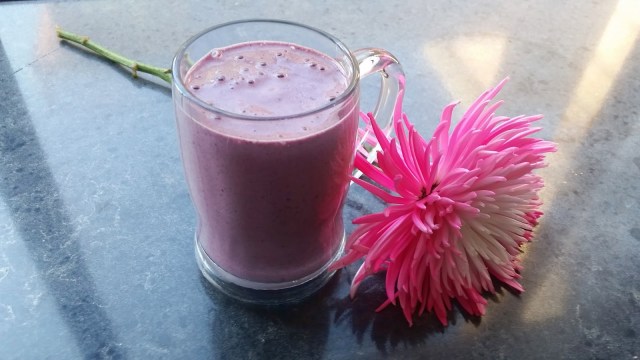 All of that aside, here is the delicious smoothie that I made for us both this morning. Simple and yummy. Pictured with one of the gorgeous flowers the Dragon got me – the colour is out of this world.